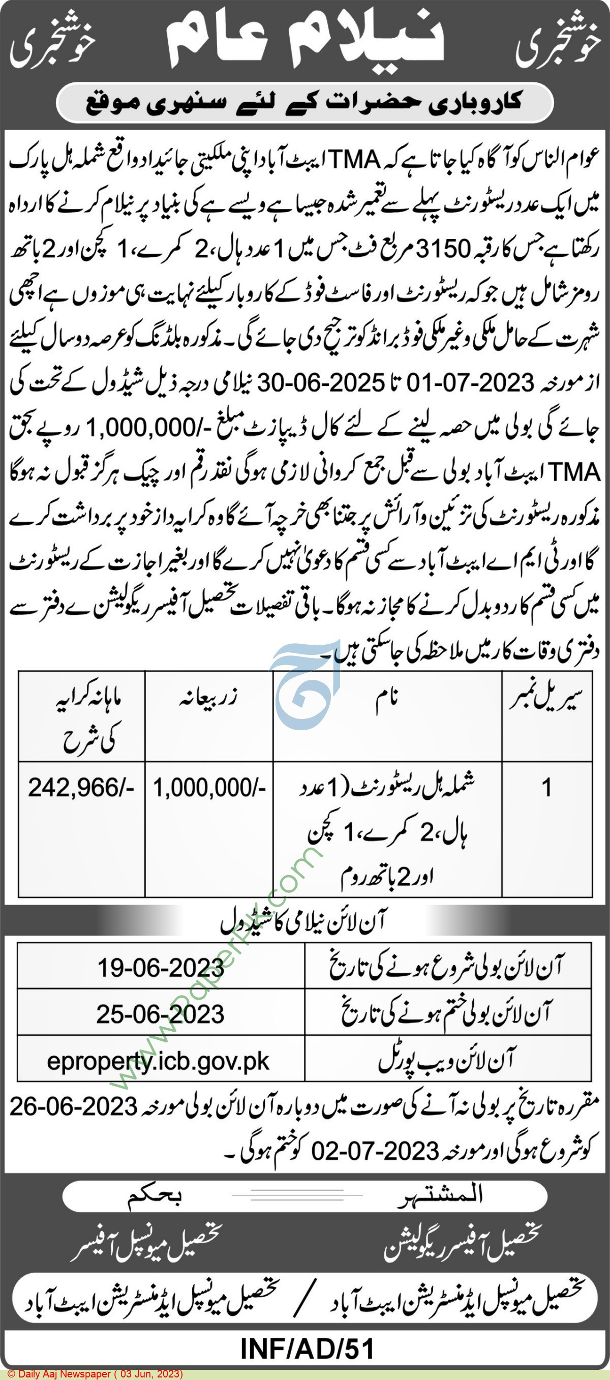 TMAایبٹ آبا دجمع کروانی لازمی ہے۔ بولی کی رقم ناقابل مجرائی، ناقابل واپسی، ناقابل منہائی ہوگی اور فریق دوئم اس رقم کی واپسی ،مجرائی ،منہائی کا مطالبہ ہرگز نہ کرے گا۔بلڈنگ کو عرصہ دو سال ازمورخہ 01-07-2023 تا 30-06-2025 کے لئے نیلام کیا جائے گا۔۲۔ ہال کا تعمیر شدہ رقبہ3150مربع فٹہے اور ماہانہ کرایہ مبلغ242,966/-روپے سے شروع ہوگا اور پہلے سال کیلئے کرایہ میں کسی قسم کا اضافہ نہیں ہوگا البتہ دوسرے سال کے لیے کرایہ میں 10%اضافہ ہوگا ۔ ۳۔کرایہ کی ادائیگی ہر ماہ کی 5تاریخ تک بطور ایڈوانس خود دفتر TMAمیں حاضر ہوکر کرنی ہوگی۔ ۴۔کرایہ بروقت جمع نہ کرنے پر فریق اول کو اختیار حاصل ہوگا کہ وہ فریق دوئم کو قرار دیتے ہوئے اس کے خلاف قانونی کاروائی کرے جو کہ بیدخلی پر مبنی بھی ہوسکتی ہے جس کے خلاف فریق دوئم کسی قسم کی قانونی چارہ جوئی نہ کرسکے گا اورساتھ میں تمام جمع شدہ رقومات بحق سرکار ضبط بھی ہوگی۔۵۔فریق دوئم بغیر تحریری اجازت فریق اول ریسٹورنٹ کو کسی دوسرے شخص کے حوالے Sublet))نہیں کر سکتے گا اور نہ ہی کسی دوسرے شخص کو اضافی کرایہ پردینے کا مجاز ہو گا۔ ۶۔ایک دفعہ Designکے مطابق اُ سکے بعدفریق دوئم کوہال پر کسی قسم کا ردوبدل /توڑپھوڑ اجازت قطعی نہ ہوگی کسی قسم کی تبدیلی کیلئے ٹی ایم اے سے پیشگی اجازت اور ٹی ایم اے تکنیکی برانچ کی معاونت ضروری ہوگی۔ ۷۔ فریق دوئم اپنے خرچ پر میٹر بجلی ،ٹیلیفون ،گیس وغیرہ لگوانے کا مجاز ہو گا اور اس پر اٹھنے تمام اخراجات خو برداشت کرے گا البتہ فریق اول سے NOCحاصل کرنا ضروری ہو گا۔ ۸۔فریق دوئم دوسرے محکمہ جات کی جانب سے عائد کردہ ٹیکس ادا کرنے کا پابند ہوگا اسی طرح TMAایبٹ آباد کی جانب سے عائد کردہ فیس/ٹیکس کاروبار ادا کرنے کا پابندہوگا نیز مشتہری بورڈ علاوہ کے چارجز معمول کے مطابق ادا کرنے کا پابند ہو گا۔ ۹۔فریق دوئم پر جملہ قوائد وضوابط کی پابند ی لازم ہوگی نیز صوبائی حکومت مقامی انتظامیہ اور TMAایبٹ آباد کی جانب سے وقتاًفوقتاً جاری کردہ ہدایات قوائد و ضوابط /شرائط کی پابندی بھی لازم ہو گی۔۱۰۔کامیاب بولی دھندہ زر نیلام کا50%منظوری کی صور ت میں تین یوم کے اندر جمع کرانے کا پابند ہو گا اور باقی زرنیلام15دن کے اندر جمع کرانے کاپابندہوگا۔ ۱۱۔نیلام شدہ جگہ پر طے شدہ کاروبار کرنے کی اجازت ہوگی اس کے علاوہ کوئی کاروبار کرنے سے قبل TMAسے پیشگی اجازت لینا لازم ہوگا۔ ۱۲۔کامیاب بولی دھندہ ایک ماہ کے اندر کاروباری سرگرمیاں شروع کرنے کا پابند ہوگا۔ ۱۳۔کامیاب بولی دھندہ کیلئے شرائط نیلام کے مطابق 15یوم کے اندر معائدہ تحریر کرنا لازمی ہوگا۔