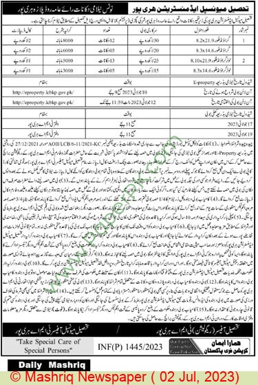 as mentioned in newspaper advertisement (Daily Mashriq Peshawar Dated 02-07-2023)