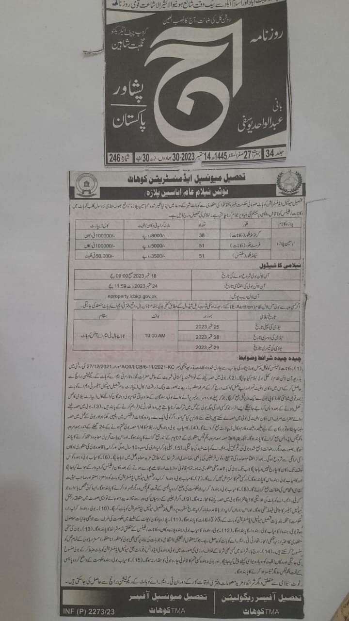 چیدہ چیدہ شرائط و ضوابط: 1۔ دکانات/فلیٹس کولو کل کو نسل بو رڈ پشا ور کی جا نب سے جا ری شدہ احکاما ت بذریعہ چٹھی نمبرAOII/LCB/6-11/2021-KC مو رخہ :27/12/2021کی روشنی میں بذریعہ آن لائن نظام/ کھلی بولی نیلام کیا جا ئیگا۔ 2۔ بولی میں حصہ لینے کے خواہشمند پاکستانی شہریت کے حامل حضرات مجوزہ فارم ٹی ایم اے کوہاٹ کے ریگولیشن برانچ سے حاصل کر کے اس میں دکان/فلیٹ نمبر اور اپنے مکمل کوائف درج کر کے ہمراہ مطلوبہ زربیعانہ بصورت بینک ڈارفٹ / ، کال ڈیپازٹ بنام تحصیل میونسپل آفیسر ٹی ایم اے کوہاٹ بمعہ قومی شناختی کارڈ کاپی بولی سے ایک دن قبل جمع کریگا۔جو کہ پہلے اور دوسرے نمبر پر آنے والے بو لی دہندگا ن کے علا وہ با قی تما م بو لی دہند گا ن کو انکے کا ل ڈیپا زٹ نیلا می کا عمل مکمل ہو نے کے بعد واپس کر دیے جا یئنگے ایسے افراد جو کسی اور کی جگہ بولی کے عمل میں شرکت کرنا چاہتے ہیں وہ اتھارٹی لیٹر فراہم کرنے کے پابند ہیں۔ 3۔ بو لی میں حصہ لینے والے حضرا ت صر ف اس دکان /فلیٹ کی بو لی میں حصہ لے سکتے ہیں جسکے لیئے فارم پرُ کیا گیا ہو ۔اگر کو ئی ایک سے زیا دہ دکا نا ت/فلیٹس میں دلچسپی رکھتا ہواور بو لی کے عمل میں حصہ لینا چا ہتا ہو تو ہر دکا ن کے لیے علیحدہ علیحدہ فار م و کال ڈیپا زٹ جمع کروائے گا ۔ 4۔ کامیاب بولی دھندہ کل زر نیلام کا 4/1 حصہ بولی ختم ہونے کے 24گھنٹے کے اندر بمعہ مروجہ انکم ٹیکس ایڈوانس جمع کرانے کا پابند ہوگا۔ جبکہ بقایا 4/3حصہ بمعہ مرو جہ انکم ٹیکس منظوری کے07یوم کے اندر جمع کرانے کا پابند ہوگا۔اور اس بابت تحریری معا ہد ہ دستخط کر نے کا پا بند ہو گا ۔بصورت دیگر زر ضما نت /جمع شدہ بو لی کی رقم بحق ٹی۔ایم۔اے کوہاٹ ضبط کی جا ئیگی ۔ 5۔ پہلی بار کرایہ داری کی میعاد 10سال ہوگی اور کرایہ باقاعدہ بولی کی منظوری/ دکان کی حوالگی سے شروع ہوگی۔ بعد از احتتام معاہدہ کی توسیع دونوں فریقین کی باہمی رضامندی اور شرائط کے مطابق مزید معاہدہ عمل میں لایا جائے گا۔ 6۔ کامیاب بولی دھند کو اُس وقت تک دکان کا چارج نہیں دیا جائیگا جب تک بولی کی باقاعدہ حتمی منظوری نہ ہو۔ تمام قانونی لوازمات اور تقاضے پورے ہونے کے بعد دکان/ فلیٹس کرایہ دار کے حوالے کیا جائیگااور کامیاب بولی دھندہ اس کا پابند ہوگا۔ اور کسی قسم کا اعتراض نہیں کرے گا۔ 7۔ کامیاب بولی دہند/ کرایہ دار تحصیل میونسپل ایڈمنسٹرینشن کوہاٹ کو دو معزز ،معتبراور صاحب حیثیت مقامی اشخاص کی ضمانت جمع کرائے گا۔ 8۔ کامیاب بولی دہند/ کرایہ دار حکومت کی وضع کردہ پالیسی کے تحت انکم ٹیکس و دیگر ٹیکسز ادا کرنے کا پابند ہوگا۔ ایسا کوئی شخص یا ادارہ جو کہ ٹی۔ایم ۔اے کو ہا ٹ کی ادا ئیگی کا ڈیفا لٹر ہو گا بو لی میں حصہ لینے کا مجا ز نہ ہوگا ۔ 9۔ اگر فریقین کے درمیان کسی وجہ سے تنازعہ پیدا ہوجائے تو ایسی صورت میں متعلقہ ریجنل میونسپل آفیسر کا ثالثی فیصلہ حتمی ہوگا۔ اور اس دوران کرایہ دار باقاعدہ ماہانہ کرایہ تاریخ مقررہ پر داخل فنڈ تحصیل میونسپل اینڈ منسٹریشن کوہاٹ کرے گا۔ 10۔ بولی دہندہ/ کرایہ دار ، حکومت/ محکمہ بلدیات تحصیل میونسپل ایڈ منسٹریشن کوہاٹ کے وقتاً فوقتاً احکامات کا پابند ہوگا۔ 11۔ پلازہ یا دکان/ یونٹ کے سلسلے میں حکومت کی طرف سے جو بھی ہدایات موصول ہو تو بولی دہندہ/ کامیاب بو لی دہندہ اسکا پابند ہوگا۔ 12۔ بولی دہندہ/ کامیاب بولی دھندہ پلازہ ، دکان ، دکانات/ فلیٹس کے متعلق تمام شرائط کا پابند ہوگا۔ 13۔ بولی کی حتمی منظوری کا اختیارزیر دستخطی/ مجاز اتھارٹی ٹی۔ایم۔اے کوہاٹ کو حاصل ہے ۔ جو کہ معقول/تکنیکی/انتظامی وجوہات کی بناء پر کسی بھی بو لی کو منظور/نامنظور/مسترد یا بو لی کے تما م عمل کو منسو خ کر سکتے ہیں۔ 14۔ درج بالا شرائط میں کسی بھی شرط کے خلاف ورزی کی صورت میں بولی دہندہ کی ایڈوانس رقومات بحق میونسپل ایڈمنسٹریشن کوہاٹ ضبط کرکے بولی منسوخ کی جائیگی اور دکان/فلیٹ کو دوبارہ نیلامی کیلئے پیش کیاجائیگا۔ اور بولی دہندہ کسی قسم کا قانونی چارہ جوئی کا حقدار نہ ہوگا۔ 15۔ کا میا ب بو لی دہندہ حکو مت کے واضع کر دہ پا لیسی 