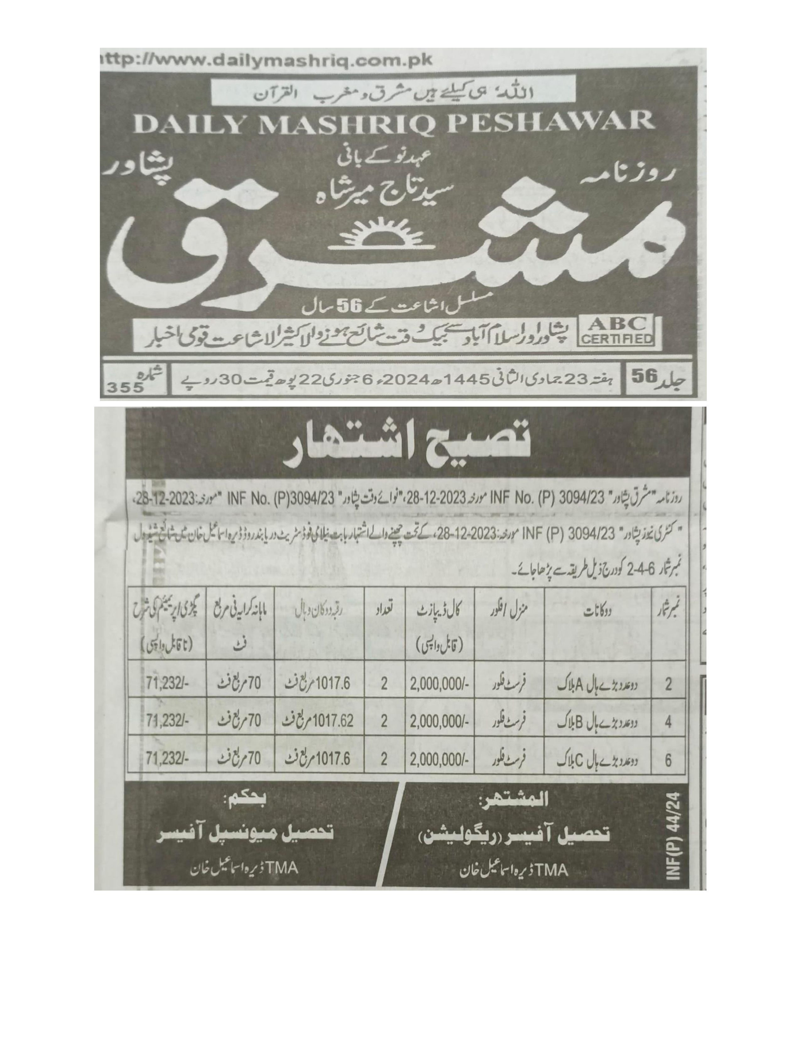 3) 33عدد دوکانات مذکو رہ 12 x 16 مربع فٹ (فی دوکان)ر قبہ پر جو کہ 3بلاک کی صورت میں تعمیر شدہ ہیں جبکہ ہع بلاک کے بالا ئی منزل پر 2عدد ہالز رقبہ 1017.6فی ہال پر مشتمل ہے۔جو کہ بذریعہ E-propertyکے مورخہ:15/01/2024یا19/01/2024شب 12بجے تک نیلام عام جو کہ