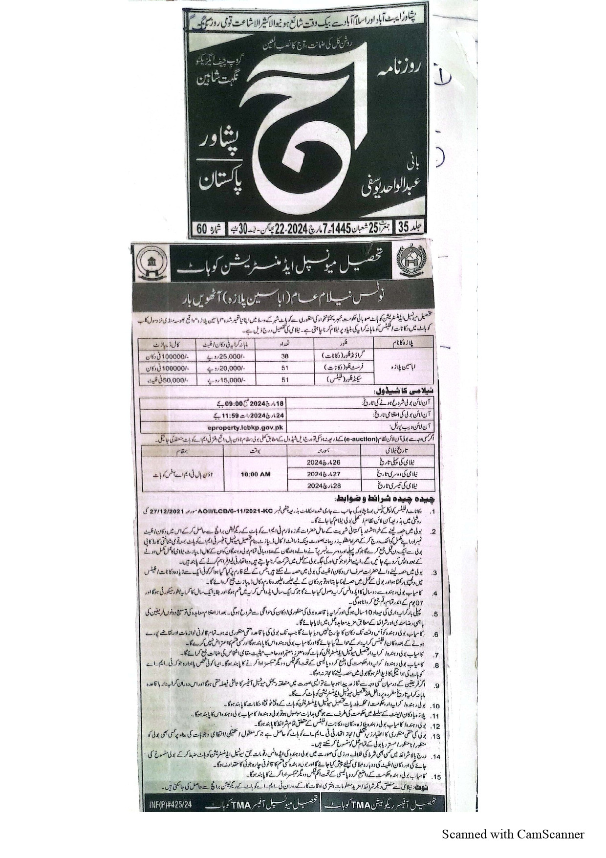 چیدہ چیدہ شرائط و ضوابط: 1۔ دکانات/فلیٹس کولو کل کو نسل بو رڈ پشا ور کی جا نب سے جا ری شدہ احکاما ت بذریعہ چٹھی نمبرAOII/LCB/6-11/2021-KC مو رخہ :27/12/2021کی روشنی میں بذریعہ آن لائن نظام/ کھلی بولی نیلام کیا جا ئیگا۔ 2۔ بولی میں حصہ لینے کے خواہشمند پاکستانی شہریت کے حامل حضرات مجوزہ فارم ٹی ایم اے کوہاٹ کے ریگولیشن برانچ سے حاصل کر کے اس میں دکان/فلیٹ نمبر اور اپنے مکمل کوائف درج کر کے ہمراہ مطلوبہ زربیعانہ بصورت بینک ڈارفٹ / ، کال ڈیپازٹ بنام تحصیل میونسپل آفیسر ٹی ایم اے کوہاٹ بمعہ قومی شناختی کارڈ کاپی بولی سے ایک دن قبل جمع کریگا۔جو کہ پہلے اور دوسرے نمبر پر آنے والے بو لی دہندگا ن کے علا وہ با قی تما م بو لی دہند گا ن کو انکے کا ل ڈیپا زٹ نیلا می کا عمل مکمل ہو نے کے بعد واپس کر دیے جا یئنگے ایسے افراد جو کسی اور کی جگہ بولی کے عمل میں شرکت کرنا چاہتے ہیں وہ اتھارٹی لیٹر فراہم کرنے کے پابند ہیں۔ 3۔ بو لی میں حصہ لینے والے حضرا ت صر ف اس دکان /فلیٹ کی بو لی میں حصہ لے سکتے ہیں جسکے لیئے فارم پرُ کیا گیا ہو ۔اگر کو ئی ایک سے زیا دہ دکا نا ت/فلیٹس میں دلچسپی رکھتا ہواور بو لی کے عمل میں حصہ لینا چا ہتا ہو تو ہر دکا ن کے لیے علیحدہ علیحدہ فار م و کال ڈیپا زٹ جمع کروائے گا ۔ 4۔ کا میا ب بو لی دہندہ سے دو سال کا ایڈ وانس کرا یہ وصول کیا جا ئے گا ۔جو کہ ایک سا ل ایڈ وانس کر ایہ میں ضم ہو گا اور بقا یا ایک سال کا کر ایہ بطو ر سیکو رٹی ہو گا۔اور 07 یو م کے اندر تمام رقم جمع کر وانا ہو گی ۔ 5۔ پہلی بار کرایہ داری کی میعاد 10سال ہوگی اور کرایہ باقاعدہ بولی کی منظوری/ دکان کی حوالگی سے شروع ہوگی۔ بعد از احتتام معاہدہ کی توسیع دونوں فریقین کی باہمی رضامندی اور شرائط کے مطابق مزید معاہدہ عمل میں لایا جائے گا۔ 6۔ کامیاب بولی دھند کو اُس وقت تک دکان کا چارج نہیں دیا جائیگا جب تک بولی کی باقاعدہ حتمی منظوری نہ ہو۔ تمام قانونی لوازمات اور تقاضے پورے ہونے کے بعد دکان/ فلیٹس کرایہ دار کے حوالے کیا جائیگااور کامیاب بولی دھندہ اس کا پابند ہوگا۔ اور کسی قسم کا اعتراض نہیں کرے گا۔ 7۔ کامیاب بولی دہند/ کرایہ دار تحصیل میونسپل ایڈمنسٹرینشن کوہاٹ کو دو معزز ،معتبراور صاحب حیثیت مقامی اشخاص کی ضمانت جمع کرائے گا۔ 8۔ کامیاب بولی دہند/ کرایہ دار حکومت کی وضع کردہ پالیسی کے تحت انکم ٹیکس و دیگر ٹیکسز ادا کرنے کا پابند ہوگا۔ ایسا کوئی شخص یا ادارہ جو کہ ٹی۔ایم ۔اے کو ہا ٹ کی ادا ئیگی کا ڈیفا لٹر ہو گا بو لی میں حصہ لینے کا مجا ز نہ ہوگا ۔ 9۔ اگر فریقین کے درمیان کسی وجہ سے تنازعہ پیدا ہوجائے تو ایسی صورت میں متعلقہ ریجنل میونسپل آفیسر کا ثالثی فیصلہ حتمی ہوگا۔ اور اس دوران کرایہ دار باقاعدہ ماہانہ کرایہ تاریخ مقررہ پر داخل فنڈ تحصیل میونسپل اینڈ منسٹریشن کوہاٹ کرے گا۔ 10۔ بولی دہندہ/ کرایہ دار ، حکومت/ محکمہ بلدیات تحصیل میونسپل ایڈ منسٹریشن کوہاٹ کے وقتاً فوقتاً احکامات کا پابند ہوگا۔ 11۔ پلازہ یا دکان/ یونٹ کے سلسلے میں حکومت کی طرف سے جو بھی ہدایات موصول ہو تو بولی دہندہ/ کامیاب بو لی دہندہ اسکا پابند ہوگا۔ (Page 01 of 02) 12۔ بولی دہندہ/ کامیاب بولی دھندہ پلازہ ، دکان ، دکانات/ فلیٹس کے متعلق تمام شرائط کا پابند ہوگا۔ 13۔ بولی کی حتمی منظوری کا اختیارزیر دستخطی/ مجاز اتھارٹی ٹی۔ایم۔اے کوہاٹ کو حاصل ہے ۔ جو کہ معقول/تکنیکی/انتظامی وجوہات کی بناء پر کسی بھی بو لی کو منظور/نامنظور/مسترد یا بو لی کے تما م عمل کو منسو خ کر سکتے ہیں۔ 14۔ درج بالا شرائط میں کسی بھی شرط کے خلاف ورزی کی صورت میں بولی دہندہ کی ایڈوانس رقومات بحق میونسپل ایڈمنسٹریشن کوہاٹ ضبط کرکے بولی منسوخ کی جائیگی اور دکان/فلیٹ کو دوبارہ نیلامی کیلئے پیش کیاجائیگا۔ اور بولی دہندہ کسی قسم کا قانونی چارہ جوئی کا حقدار نہ ہوگا۔ 15۔ کا میا ب بو لی دہندہ حکو مت کے واضع کر دہ پا لیسی کے تحت انکم ٹیکس و دیگر ٹیکسز ادا کر نے کا پا بند ہو گا ۔ نوٹ: نیلامی سے متعلق دیگر شرا ئط /مزید معلومات دفتری اوقات کار کے دوران ٹی۔ای