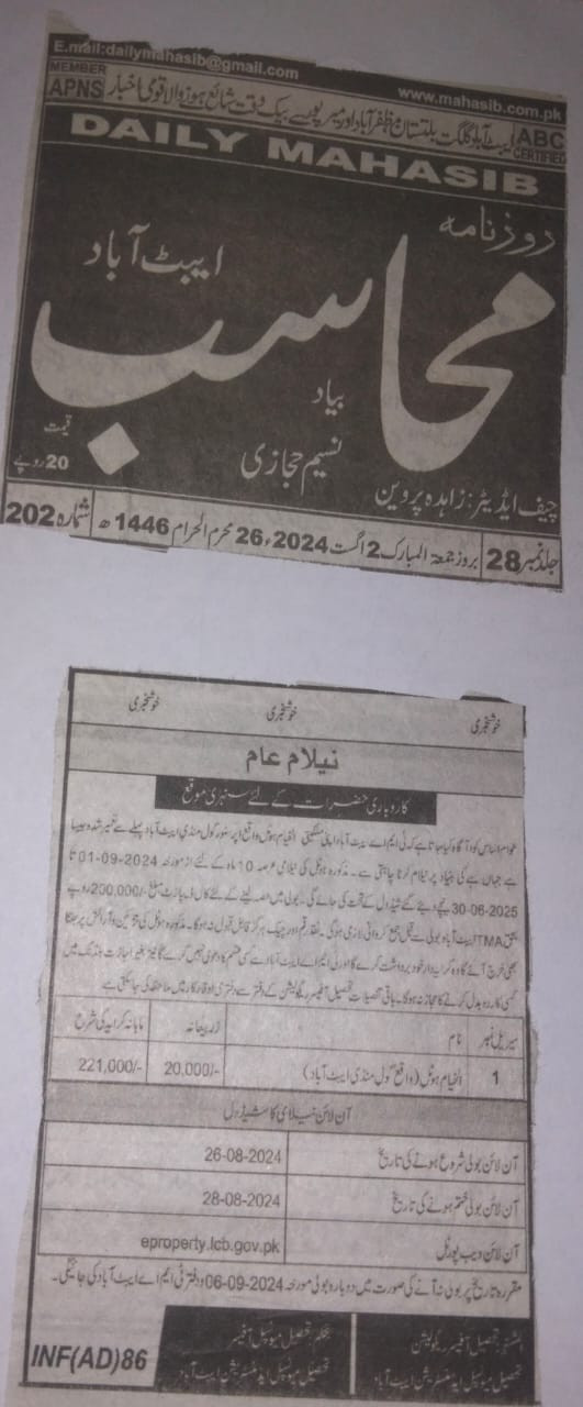 تحصیل میونسپل ایڈمنسٹریشن ایبٹ آباد اپنے ملکیتی الخیام ہوٹل کو جہاں ہے جیسے ہے کی بنیاد پر عرصہ01سال کے لیے کرایہ پر نیلام عام کرنا چاہتی ہے نیلام عام کیلئے درجہ ذیل شرائط کی پابندی لازم ہوگی۔