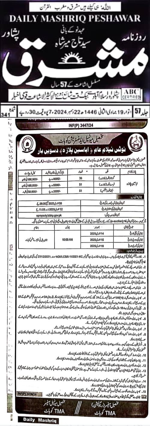 چیدہ چیدہ شرائط و ضوابط: 1۔ دکانات/فلیٹس کولو کل کو نسل بو رڈ پشا ور کی جا نب سے جا ری شدہ احکاما ت بذریعہ چٹھی نمبر KC-2021/11-6/LCB/AOII مو رخہ :2021/12/27کی روشنی میں بذریعہ آن الئن نظام/ کھلی بولی نیالم کیا جا ئیگا۔ 2۔ بولی میں حصہ لینے کے خواہشمند پاکستانی شہریت کے حامل حضرات مجوزہ فارم ٹی ایم اے کوہاٹ کے ریگولیشن برانچ سے حاصل کر کے اس میں دکان/فلیٹ نمبر اور اپنے مکمل کوائف درج کر کے ہمراہ مطلوبہ زربیعانہ بصورت بینک ڈارفٹ / ، کال ڈیپازٹ بنام تحصیل میونسپل آفیسر ٹی ایم اے کوہاٹ بمعہ قومی شناختی کارڈ کاپی بولی سے ایک دن قبل جمع کریگا۔جو کہ پہلے اور دوسرے نمبر پر آنے والے بو لی دہندگا ن کے عال وہ با قی تما م بو لی دہند گا ن کو انکے کا ل ڈیپا زٹ نیال می کا عمل مکمل ہو نے کے بعد واپس کر دیے جا یئنگے ایسے افراد جو کسی اور کی جگہ بولی کے عمل میں شرکت کرنا چاہتے ہیں وہ اتھارٹی لیٹر فراہم کرنے کے پابند ہیں۔ 3۔ بو لی میں حصہ لینے والے حضرا ت صر ف اس دکان /فلیٹ کی بو لی میں حصہ لے سکتے ہیں جسکے لیئے فارم پ ُر کیا گیا ہو ۔اگر کو ئی ایک سے زیا دہ دکا نا ت/فلیٹس میں دلچسپی رکھتا ہواور بو لی کے عمل میں حصہ لینا چا ہتا ہو تو ہر دکا ن کے لیے علیحدہ علیحدہ فار م و کال ڈیپا زٹ جمع کروائے گا ۔ 4۔ کامیاب بولی دھندہ کل زر نیالم کا 4/1 حصہ بولی ختم ہونے کے 24گھنٹے کے اندر بمعہ مروجہ انکم ٹیکس ایڈوانس جمع کرانے کا پابند ہوگا۔ جبکہ بقایا 4/3حصہ بمعہ مرو جہ انکم ٹیکس منظوری کے07یوم کے اندر جمع کرانے کا پابند ہوگا۔اور اس بابت تحریری معا ہد ہ دستخط کر نے کا پا بند ہو گا ۔بصورت دیگر زر ضما نت /جمع شدہ بو لی کی رقم بحق ٹی۔ایم۔اے کوہاٹ ضبط کی جا ئیگی ۔ 5۔ پہلی بار کرایہ داری کی میعاد 10سال ہوگی اور کرایہ باقاعدہ بولی کی منظوری/ دکان کی حوالگی سے شروع ہوگی۔ بعد از احتتام معاہدہ کی توسیع دونوں فریقین کی باہمی رضامندی اور شرائط کے مطابق مزید معاہدہ عمل میں الیا جائے گا۔ 6۔ کامیاب بولی دھند کو اُس وقت تک دکان کا چارج نہیں دیا جائیگا جب تک بولی کی باقاعدہ حتمی منظوری نہ ہو۔ تمام قانونی لوازمات اور تقاضے پورے ہونے کے بعد دکان/ فلیٹس کرایہ دار کے حوالے کیا جائیگااور کامیاب بولی دھندہ اس کا پابند ہوگا۔ اور کسی قسم کا اعتراض نہیں کرے گا۔ 7۔ کامیاب بولی دہند/ کرایہ دار تحصیل میونسپل ایڈمنسٹرینشن کوہاٹ کو دو معزز ،معتبراور صاحب حیثیت مقامی اشخاص کی ضمانت جمع کرائے گا۔ 8۔ کامیاب بولی دہند/ کرایہ دار حکومت کی وضع کردہ پالیسی کے تحت انکم ٹیکس و دیگر ٹیکسز ادا کرنے کا پابند ہوگا۔ ایسا کوئی شخص یا ادارہ جو کہ ٹی۔ایم ۔اے کو ہا ٹ کی ادا ئیگی کا ڈیفا لٹر ہو گا بو لی میں حصہ لینے کا مجا ز نہ ہوگا ۔ 9۔ اگر فریقین کے درمیان کسی وجہ سے تنازعہ پیدا ہوجائے تو ایسی صورت میں متعلقہ ریجنل میونسپل آفیسر کا ثالثی فیصلہ حتمی ہوگا۔ اور اس دوران کرایہ دار باقاعدہ ماہانہ کرایہ تاریخ مقررہ پر داخل فنڈ تحصیل میونسپل اینڈ منسٹریشن کوہاٹ کرے گا۔ احکامات 10۔ بولی دہندہ/ کرایہ دار ، حکومت/ محکمہ بلدیات تحصیل میونسپل ایڈ منسٹریشن کوہاٹ کے وقتاً فوقتاً کا پابند ہوگا۔ 11۔ پالزہ یا دکان/ یونٹ کے سلسلے میں حکومت کی طرف سے جو بھی ہدایات موصول ہو تو بولی دہندہ/ کامیاب بو لی دہندہ اسکا پابند ہوگا۔ (Page 01 of 02) 12۔ بولی دہندہ/ کامیاب بولی دھندہ پالزہ ، دکان ، دکانات/ فلیٹس کے متعلق تمام شرائط کا پابند ہوگا۔ 13۔ بولی کی حتمی منظوری کا اختیارزیر دستخطی/ مجاز اتھارٹی ٹی۔ایم۔اے کوہاٹ کو حاصل ہے ۔ جو کہ معقول/تکنیکی/انتظامی وجوہات کی بناء پر کسی بھی بو لی کو منظور/نامنظور/مسترد یا بو لی کے تما م عمل کو منسو خ کر سکتے ہیں۔ 14۔ درج باال شرائط میں کسی بھی شرط کے خالف ورزی کی صورت میں بولی دہندہ کی ایڈوانس رقومات بحق میونسپل ایڈمنسٹریشن کوہاٹ ضبط کرکے بولی منسوخ کی جائیگی اور دکان/فلیٹ کو دوبارہ نیالمی کیلئے پیش کیاجائیگا۔ اور بولی دہندہ کسی قسم کا قانونی چارہ جوئی کا حقدار نہ ہوگا۔ 15۔ کا میا ب بو لی دہندہ حکو مت کے واضع کر د