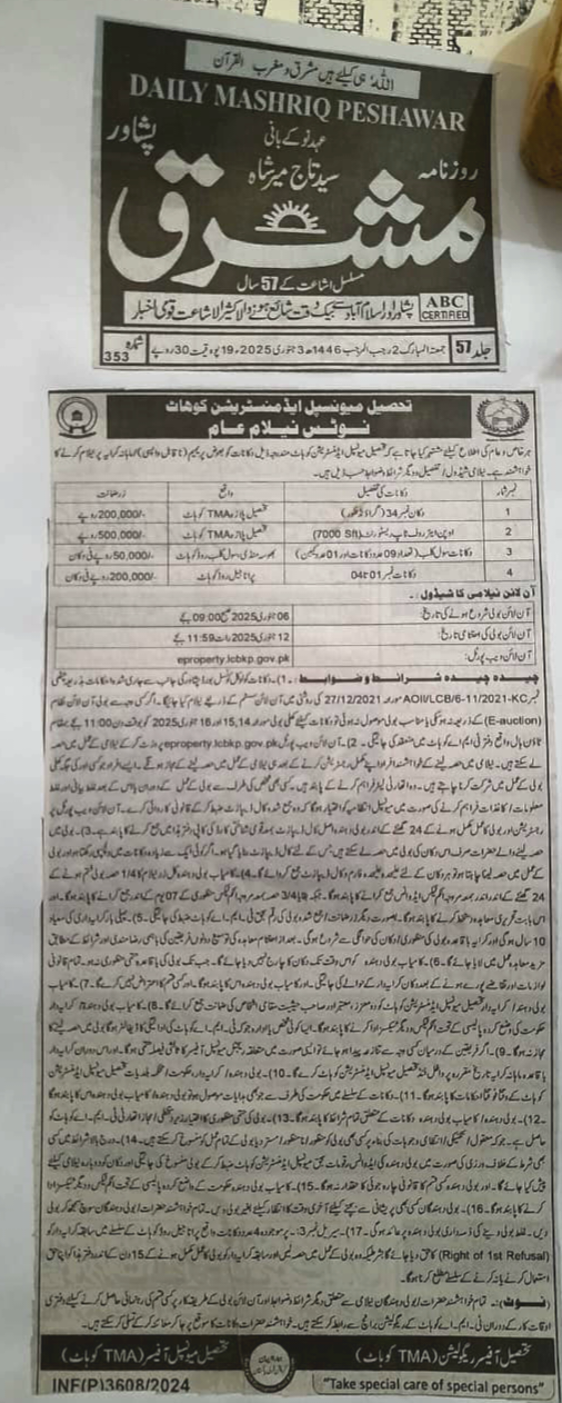 دکا نا ت کیلئے کھلی بو لی مورخہ14 ، 15 اور 16جنو ری 2025کو بو قت دن 00:11 بجے بمقا م ٹا ون