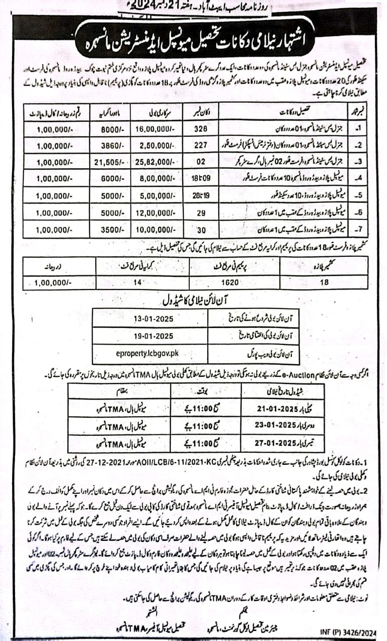 شرائط نیلام دکانات تحصیل میونسپل ایڈمنسٹریشن مانسہرہ 1۔ بولی میں حصہ لینے والے خواہشمند حضرات آن لائن /اوپن نیلامی فارم حاصل کر کے اس میں دکان نمبر اور اپنے مکمل قوائد درج کر کے ہمراہ زر بیعانہ مبلغ 100,000/-روپے بصورت بینک ڈرافٹ /کال ڈپازٹ قابل واپسی بمع شناختی کارڈ کاپی بنام تحصیل میونسپل آفیسر ، تحصیل میونسپل ایڈمنسٹریشن مانسہرہ بولی سے ایک روز قبل جمع کروائے گا جو کہ ناکام بولی دہندہ کو بعداز اختتام بولی واپس کیا جائے گا۔ 2۔ آن لائن بولی میں حصہ لینے والے وہ حضرات جو بولی شروع ہونے سے قبل نیلامی فارم دفتر ہذا سے حاصل کر کے مبلغ -/100،000روپے بصورت بینک ڈرافٹ / کال ڈیپازٹ قابل واپسی بنام تحصیل میونسپل آفیسرتحصیل میونسپل ایڈمنسٹریشن مانسہرہ جمع نہیں کروائے گا اس کی آن لائن بولی قابل قبول نہیں ہو گی۔ 3۔ ٹی ایم اے مانسہرہ کی طرف سے ایڈوانس رقم /پریمیم کا آغاز بمطابق اشتہار سے بولی کا آغاز کیا جائے گااور زیادہ ایڈوانس /پریمیم کی بولی دینے والے فرد /بولی دہندہ کی پیشکش کو منظوری کے لئے قبول کیا جائے گا۔ ذیادہ بولی منظور ہونے کی صورت میں کامیاب بولی دہندہ ایڈوانس /پریمیم کی کل رقم میعاد 7ایام کے اندر اند ر جمع کرنے کا پابند ہو گااور تحریری معاہدہ عمل میں لایا جائے گا۔ ناکامی کی صورت میں زر بیعانہ بحق تحصیل میونسپل ایڈمنسٹریشن مانسہرہ ضبط کیا جائے گا ۔ 4۔ دکان کے لئے مقرر شدہ ماہوار کرایہ بمطابق اشتہار وصول کیا جائے گا ۔ ماہانہ کرایہ ہر ماہ کی 5تاریخ تک ایڈوانس جمع کروانا لازمی ہو گا ۔ مسلسل تین ماہ عدم ادائیگی کی صورت میں ٹی ایم اے کو اختیار حاصل ہو گا کہ وہ معاہدہ منسوخ کر کے دکان خالی کرے اس سلسلے میں کرایہ دار کا کوئی عذر قابل قبول نہ ہو گا۔ 5۔ پہلی بار معاہدہ کی معیاد 10سال ہو گی اور کرایہ دار باقاعدہ بولی کی منظوری /دکان کی حوالگی سے شروع ہوگی ۔ بعداز اختتام معاہدہ کی توسیع دونوں فریقین کی باہمی رضا مندی سے مزید 10سال کے لیئے قابل توسیع ہو گی اور شرائط کے مطابق مزید معاہدہ عمل میں لایا جائے گا ۔ 6۔ حکومتی پالیسی کے مطابق کرایہ میں ہر سال 10%اضافہ کیا جائے گا ۔ 7۔ ایڈوانس /پریمیم ناقابل واپسی ہوگی البتہ ٹی ایم اے کو دکان کی ضرورت بادوران معاہدہ پیش آیا تو خالی کرنے کی صورت میں ایڈوانس /پریمیم معاہدہ ختم کرنے کی مدت کے لحاظ سے طے کرنے کے بعد واپس کی جائے گی ۔ 8۔ کامیاب بولی دہندہ کو اس وقت تک دکان کا چارج نہیں دیا جائے گا جب تک بولی کی باقاعدہ حتمی منظوری نہ ہواور پریمیم کی کلی رقم ادا نہ کر دی جائے۔ تمام قانونی لوازمات و تقاضے پورے ہونے کے بعد دکان کرایہ دار کے حوالے کی جائے گی اور بولی دہندہ اس کو پابند ہو گااور کسی قسم کا اعتراض نہیں کرے گا۔ 9۔ بولی میں حصہ لینے والے حضرات صرف اسی دکان کی بولی میں حصہ لے سکیں گے جس کے لئے فارم پر کیا گیا ہو۔ اگر کوئی ایک سے ذیادہ دکانات میں دلچسپی رکھتا ہو اور بولی میں حصہ لینا چاہتا ہو تو ہر دکان کے لئے علیحدہ علیحدہ فارم و کال ڈیپازٹ جمع کرے گا۔ 10۔ دکان مذکورہ میں کامیاب بولی دہندہ /کرایہ دار خود کاروبار کرے گا کسی دوسرے شخص پر فروخت کرنے یا کسی کو شکمی کرائے پر دینے کی اجازت نہ ہو گی البتہ منتقلی کی صورت میں کم از کم ایک لاکھ100,000/-روپے ٹرانسفر فیس ناقابل واپسی بطور منتقلی فیس ٹی ایم اے کو جمع کی جائے گی ۔ ٹی ایم اے مانسہرہ معروضی حالات کے مطابق ٹرانسفر فیس میں اضافہ کر سکتی ہے اور بولی دہندہ جمع شدہ ایڈوانس /پریمیم رقم کی واپسی کا تقاضہ نہیں کرے گا اور دکان کو قانونی طریقہ کار کے مطابق دوسرے شخص کو منتقل کی جائے گا۔ بصورت دیگر دکان کی الاٹمنٹ منسوخ کی جائے گی اگر بولی دہندہ خود مقررہ وقت سے پہلے دکان چھوڑتا ہے یا دکان چلانے میں دلچسپی نہ رکھتا ہو تو ایسی صورت میں بولی دہندہ کے جمع کردہ رقومات بحق تحصیل میونسپل ایڈمنسٹریشن مانسہرہ ضبط کر کے معاہدہ منسوخ کیاجائے گااور قانونی طریقہ کار کے مطابق دکان کی دوبارہ نیلامی کی جائے گی ۔ 11۔ بولی دہندہ / کرایہ دار تحصیل میونسپل ایڈمنسٹری