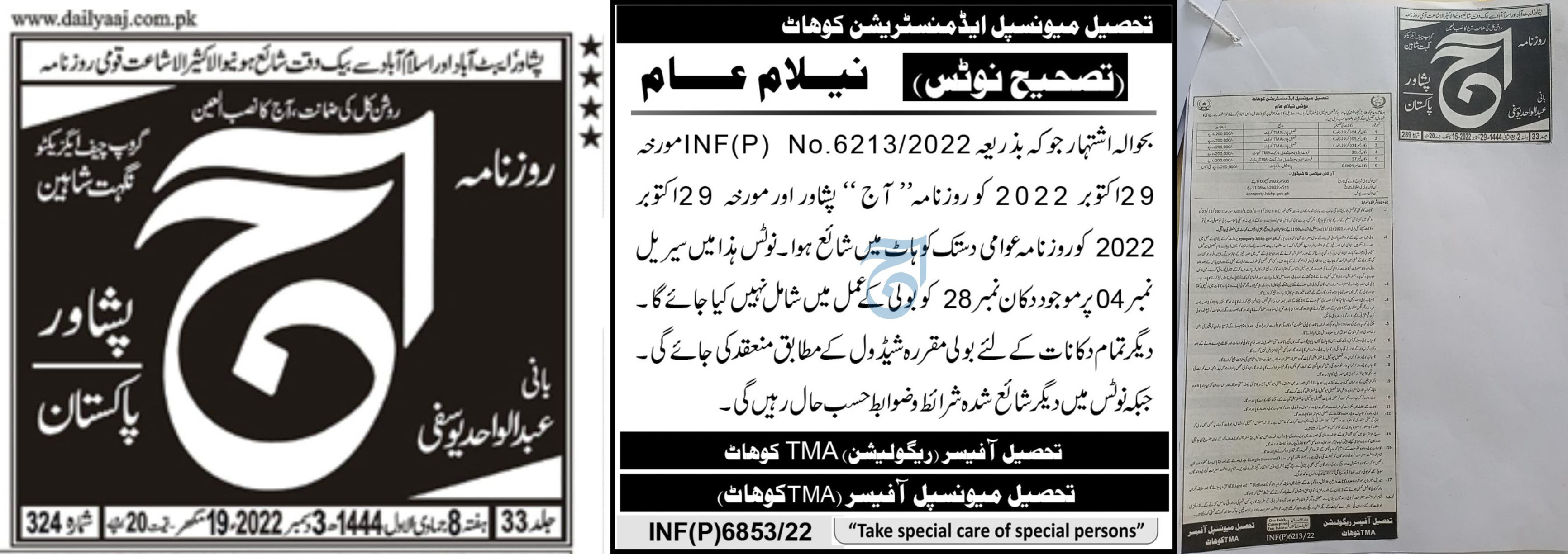 تحصیل میونسپل ایڈمنسٹریشن کوہاٹ کو ہا ٹ کو درج ذیل شرائط پر مقرر شدہ پریمیم (نا قابل وا پسی) کے تحت اپنی پر اپر ٹی /دکانات نیلام کرنا چاہتی ہے ۔ نیلامی میں ذیادہ پریمیم کی بولی دینے والے فرد / بولی دہندہ کو دکانات/جائیداد الاٹ کیا جائیگا۔