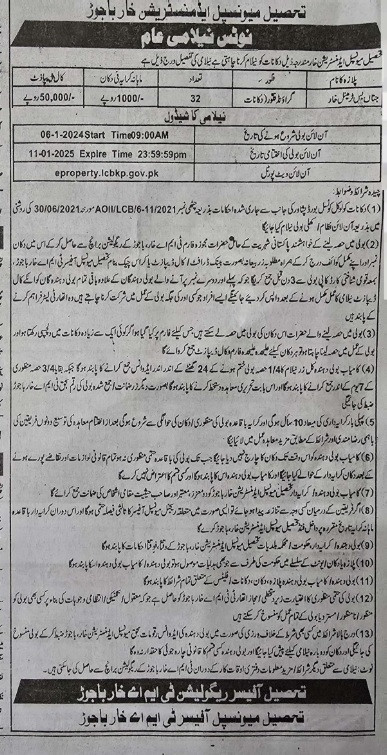 <strong>نوٹ:</strong> نیلامی سے متعلق دیگر شرائط/ مزید معلومات دفتری اوقات کار کے دوران ٹی ایم اے خا ر، با جو ڑ کے ریگولیشن برانچ سے حاصل کی جاسکتی ہیں۔</p>