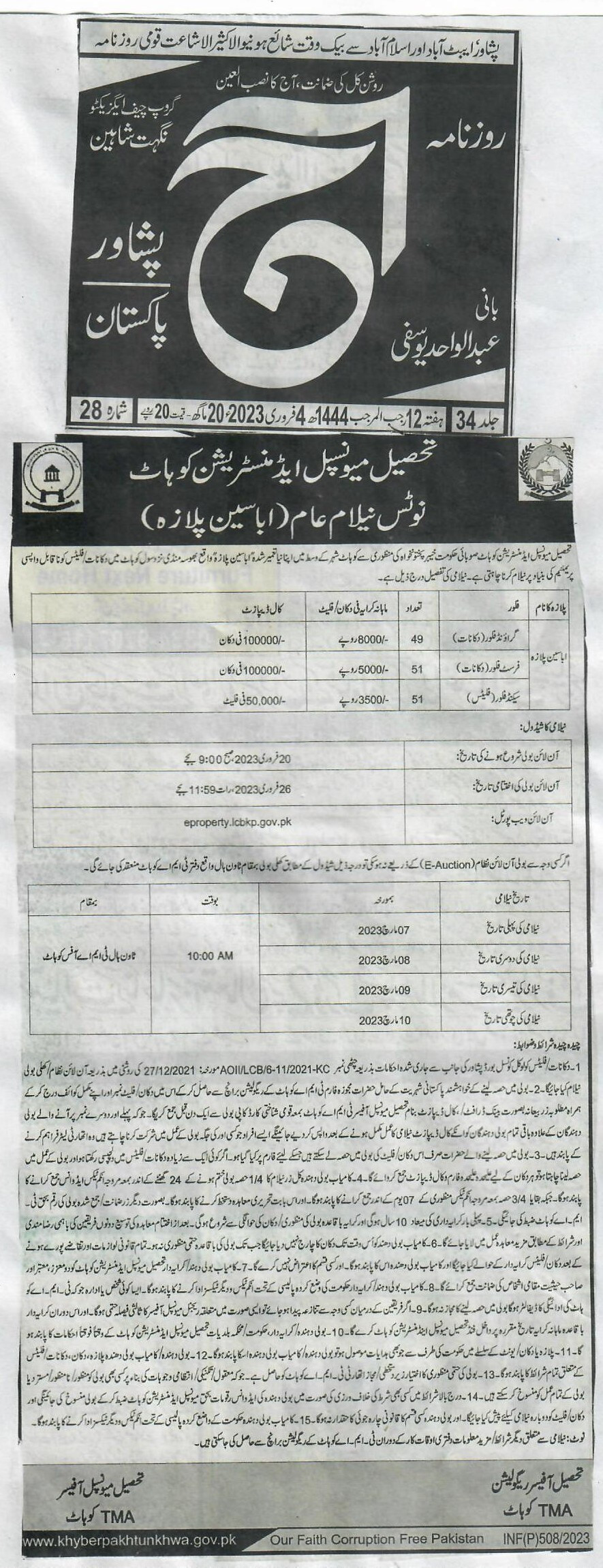 تحصیل میونسپل ایڈمنسٹریشن کوہاٹ صوبائی حکومت خیبر پختونخوا کی منظوری سے بمقام بھو سہ منڈی نز د سول کلب کو ہا ٹ شہر میں تعمیر کر دہ اباسین پلازہ ٹی ایم اے کو درج ذیل شرائط پر مقرر شدہ پریمیم (بمطابق ماکیٹ ریٹ ) کے تحت نیلام کرنا چاہتی ہے ۔ نیلامی میں ذیادہ پریمیم کی بولی دینے والے فرد / بولی دہندہ کو دکانات/فلیٹس / جائیداد الاٹ کیا جائیگا۔ 1۔ بولی میں حصہ لینے والے خواہشمند افراد دفتر ٹی ایم اے آفس سے آن لائن فارم حاصل کر کے اس میں دکان / یونٹ نمبر اور اپنے مکمل کوائف درج کر کے ہمراہ مندر جہ ذیل حسا ب سے زربیعانہ بصورت بینک ڈرافٹ / کال ڈیپازٹ بمعہ شناختی کارڈ کاپی بنام تحصیل میونسپل آفیسر تحصیل میونسپل ایڈمنسٹریشن کوہاٹ جمع کرے گا۔ جو کہ ناکام بولی دہند کو بعد از اختتام بولی واپس کیا جائیگا۔ 2۔ ٹی ایم اے کوہاٹ کی طرف سے ایڈوانس ۔۔۔۔۔۔۔۔۔۔۔ ۔۔۔۔۔۔۔۔۔۔۔۔۔۔روپے سے بولی کا آغاز کیا جائیگا۔ اور ذیادہ ایڈوانس / پریمیم کی بولی دینے والے فرد/ بولی دہند کی پیشکش کو منظوری کیلئے قبول کیا جائیگا۔ پابند ہوگا اور تحریری معاہدہ عمل میں لائے جائیگا ناکامی کی صورت میں زربیعانہ بحق تحصیل میونسپل ایڈمنسٹریشن ۔۔۔۔۔۔۔۔۔۔۔۔ ضبط کیا جائیگا۔ کامیاب بولی دہند ہ کل زرنیلام کا 4/1حصہ بولی ختم ہونے کے 24 گھنٹے کے اندراندر ایڈوانس جمع کرنے کا پابند ہوگا جبکہ بقایا 4/3حصہ منظوری کے سات یوم کے اندر اندر جمع کرانے کا پابند اور اس بابت تحریری معاہدہ دستخط کرنے کا پابند ہوگا۔ 3۔ دکان کے لئے مقرر شہد ماہوار کرایہ مبلغ ۔۔۔۔۔۔۔۔۔۔۔۔۔۔ روپے فی مربع فٹ بمطابق مارکیٹ ریٹ مقرر ہوگی۔ ماہانہ کرایہ ہر ماہ کی پانچ تاریخ تک بطور ایڈوانس جمع کرنا لازمی ہوگا۔ مسلسل تین ماہ عدم ادائیگی کی صورت میں ٹی ایم اے کو اختیار حاصل ہوگا کہ وہ معاہدہ منسوخ کر کے دکان خالی کریں ۔ اس سلسلے میں کرایہ دار کا کوئی عذر قابل قبول نہ ہوگا۔ 4۔ پہلی بار کرایہ داری کی معیاد دس10سال ہوگی او ر کرایہ باقاعدہ بولی کی منظوری / دکان کی حوالگی سے شروع ہو گی بعد از اختتام معاہدہ کی توسیع دونوں فریقین کی باہمی رضامندی اور شرائط کے مطابق مذید معاہد ہ عمل میں لایا جائیگا۔ 5۔ ایڈوانس / پریمیم نا قابل واپسی ہوگی البتہ ٹی ایم اے کو دکان کی ضورت بدوران معاہدہ پیش آیا تو خالی کرنے کی صور ت میں ایڈوانس / پریمیم معاہدہ ختم کرنے کی مدت کے لحاظ سے طے کرنے کے بعد واپس کی جاسکتی ہے۔ 6۔ کامیاب بلی دہند ہ کو اُس وقت تک دکان کا چارج نہیں دیا جائیگا جب تک بولی کی باقادہ حتمی منظوری نہ ہو تو تمام قانونی لوازمات وتقاضے پورے ہونے کے بعد دکان / یونٹ کرایہ دار کے حوالہ کیا جائیگا۔ اور کامیاب بولی دہند اس کا پابند ہو گا۔ اور کسی قسم کا اعتراض نہیں کرے گا۔ 7۔ بولی میں حصہ لینے والے حضرات صرف اُس دکان کی بولی میں حصلہ لیں سکتے ہیں جس کے لئے فارم پرُ کیا گیا ہو ۔ اگر کوئی ایک سے ذیادہ دکانات میں دلچسپی رکھتا ہو اور بولی میں حصہ لینا چاہتا ہو تو ہر دکان کے لئے علیحدہ علیحدہ فارم و کال ڈپازٹ جمع کروائیگا۔ 8۔ دکان مذکورہ میں کامیاب بولی دہند/ کرایہ دار خود کاروبار کرے گا کسی دوسرے شخص پر فروخت کرنے یا کسی کو شکمی کرایہ پر دینے کی اجازت نہ ہو گی البتہ منتقلی کی صورت میں کم از کم ایک لاکھ روپے ٹرانسفر فیس ناقابل واپسی بطور منتقلی فیس ٹی ایم اے کو جمع کی جائیگی۔ ٹی ایم اے معروضی حالات کے مطابق ٹرانسفر فیس میں اضافہ کر سکتی ہے اور بولی دہند جمع شدہ ایڈوانس / پریمیم رقم کی واپسی کا تقاضا نہیں کریگا اور دکان کو قانونی طریقہ کار کے مطابق دوسرے شخص کو منتقل کیا جائے گا۔ بصورت دیگر دکان کی الاٹمنٹ منسوخ کی جائیگی اگر بولی دہند ہ خود وقت مقررہ سے پہلے دکان چھوڑتا ہے یا دکان چلانے میں دلچسپی نہ رکھتان ہو تو ایسی صورت میں بولی دہند کے جملہ جمع کردہ رقومات بحق تحصیل میونسپل ایڈمنسٹریشن کوہاٹ ضبط کر کے معاہدہ منسوخ کیا جائیگا اور قانونی طریقہ کار کے مطابق دکان کا دوبارہ نیلام کیا جائیگا۔ 9۔ بولی دہندہ / کرایہ دار تحصیل میونسپ